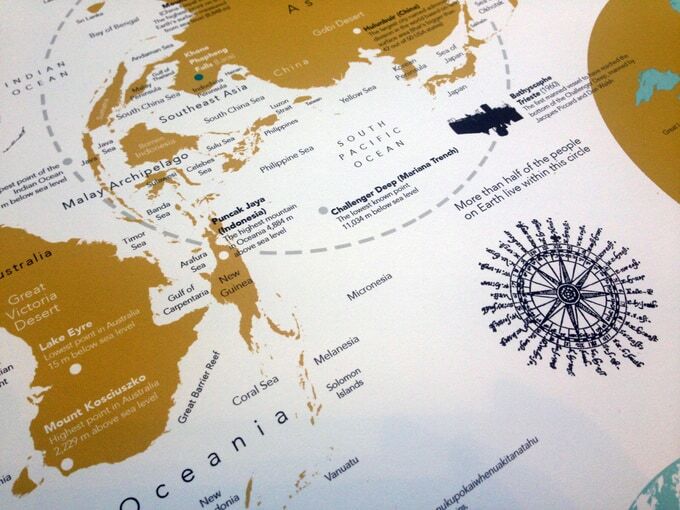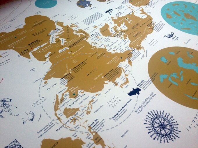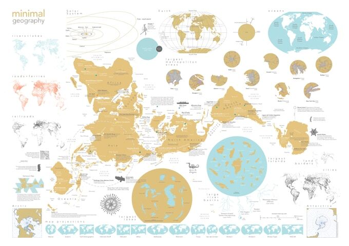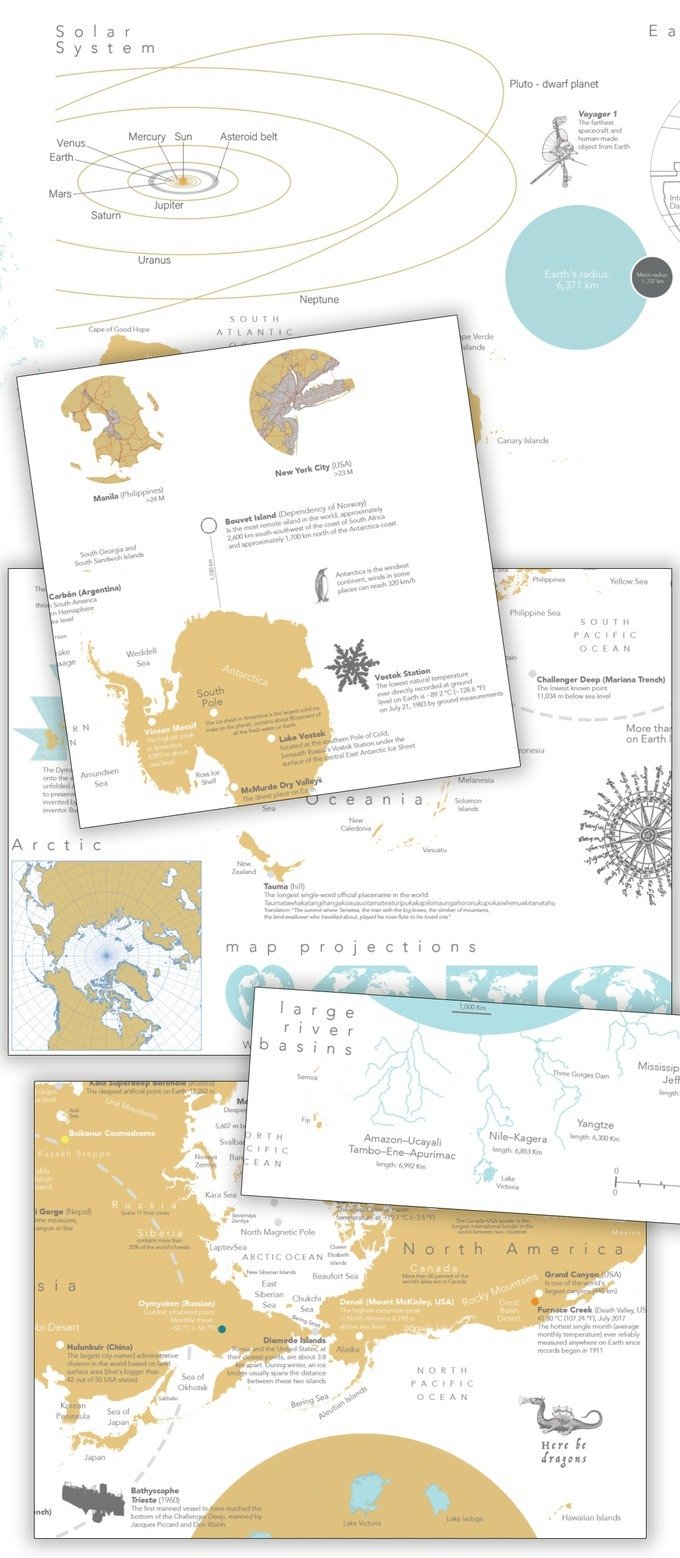 As a graphic designer and cartographer, it has always been my ambition to create a poster map that is different from the ones you usually see. The result of this project is a map that combines an infographic conception of the planet with a touch of curiosity. The central map, in a Dymaxion projection, is the element around which a variety of data and thematic layers are displayed.